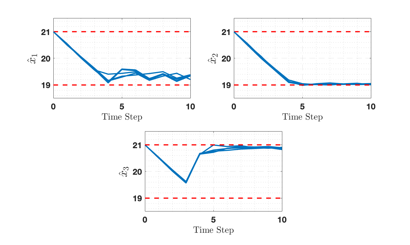 A 3D room temperature model is controlled to stay within safe temperature bounds (shown by red dashes) over a finite time horizon of 10 steps.