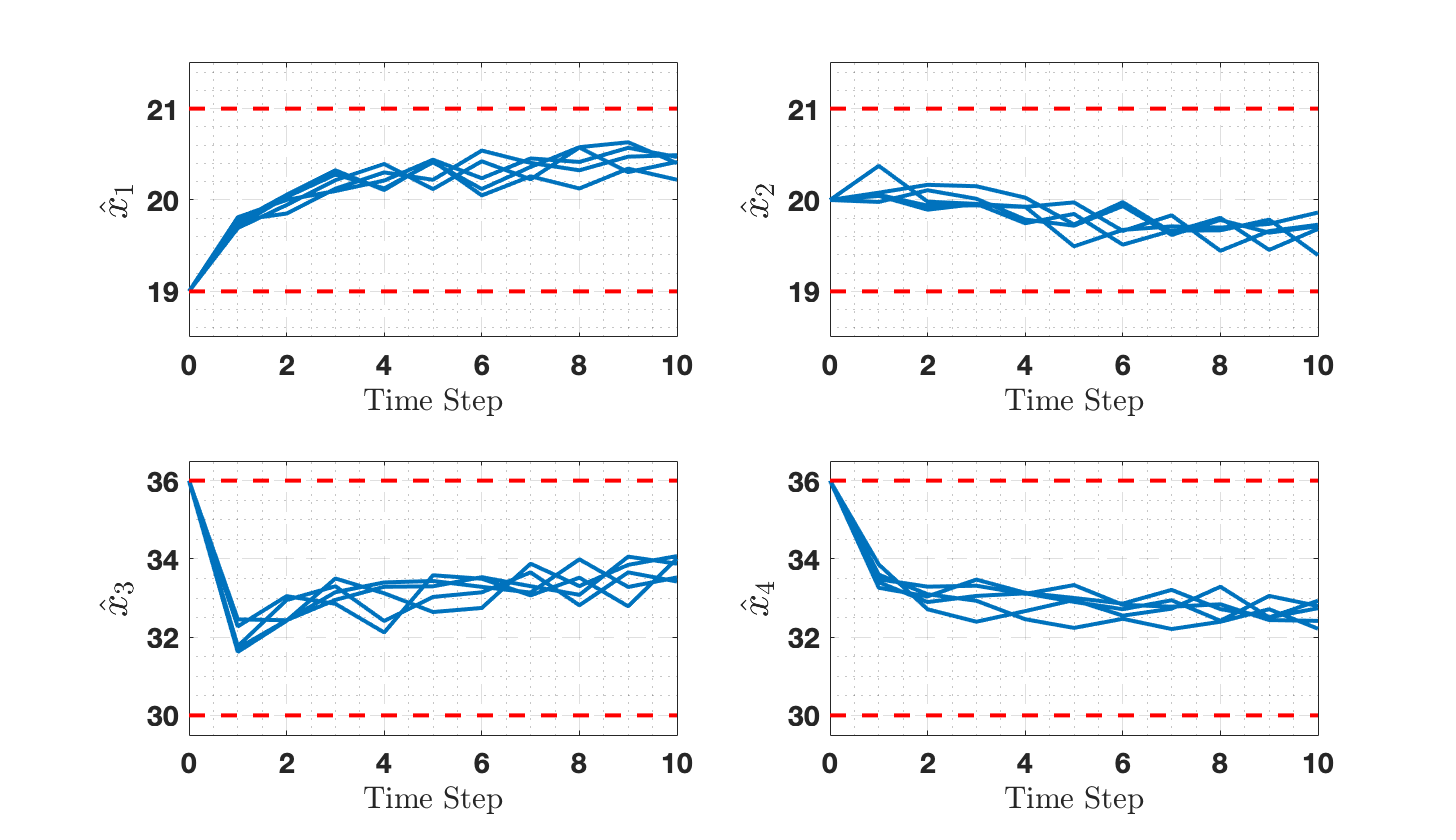 A 4D building automation system controller maintains temperatures in 4 rooms within safe bounds over 10 time steps.